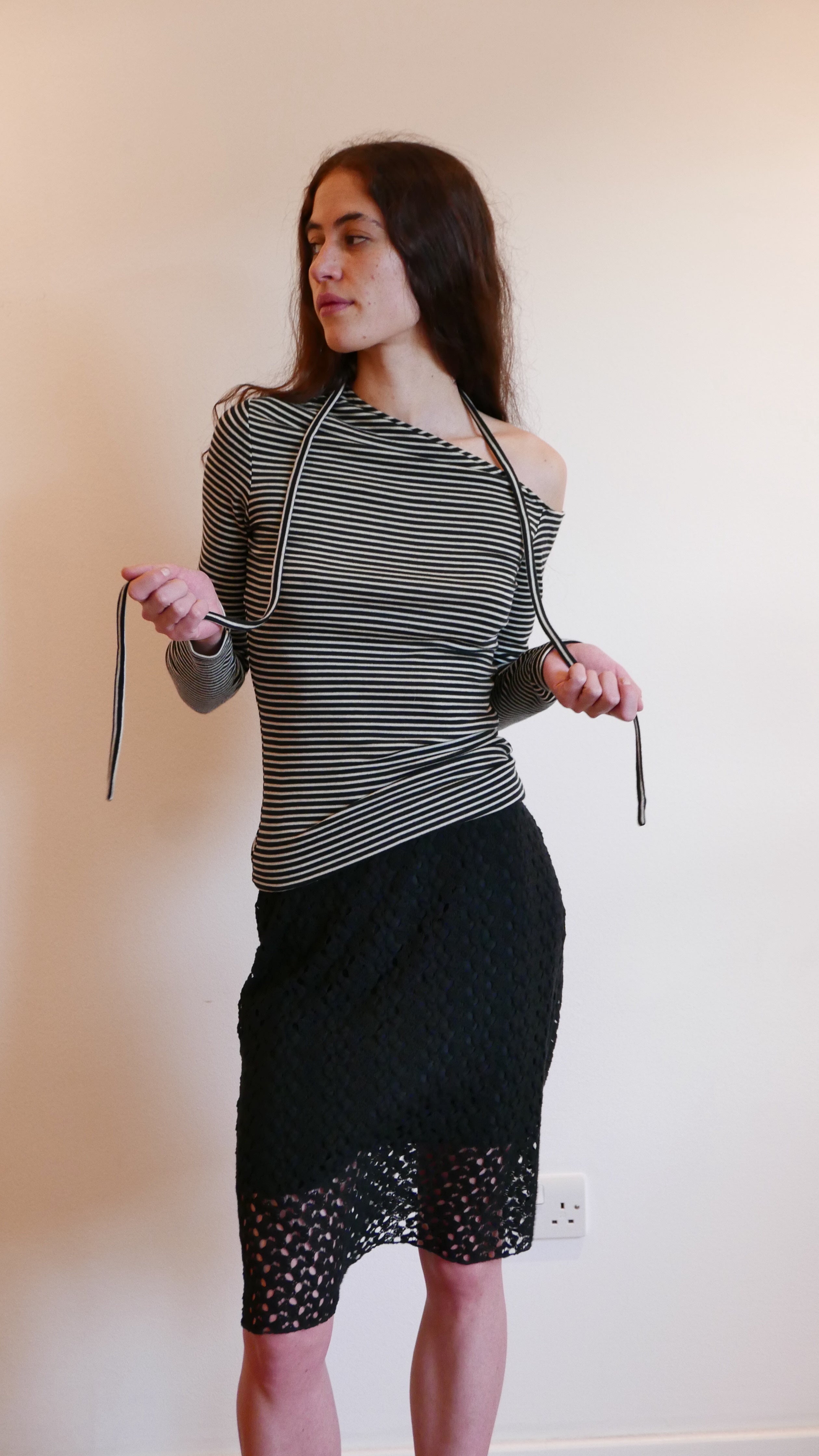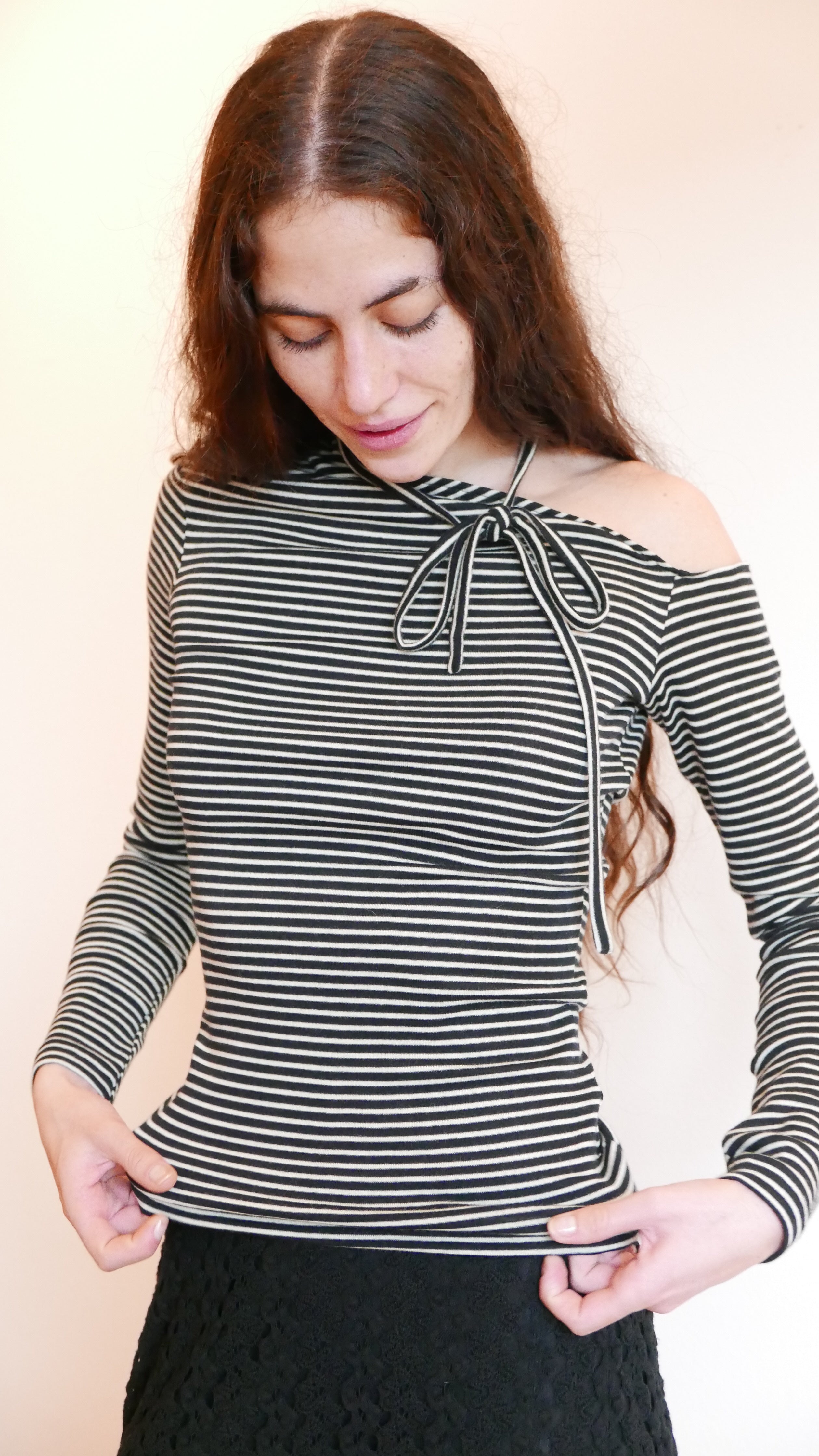 100% Cotton, asymmetrical stripy long sleeve top with neck tie to style as you please.