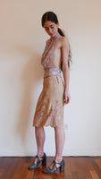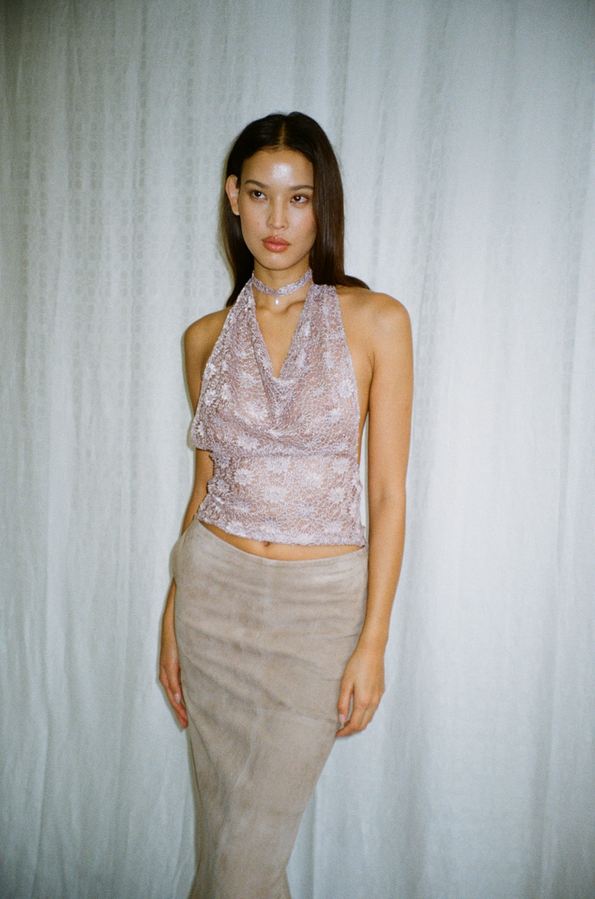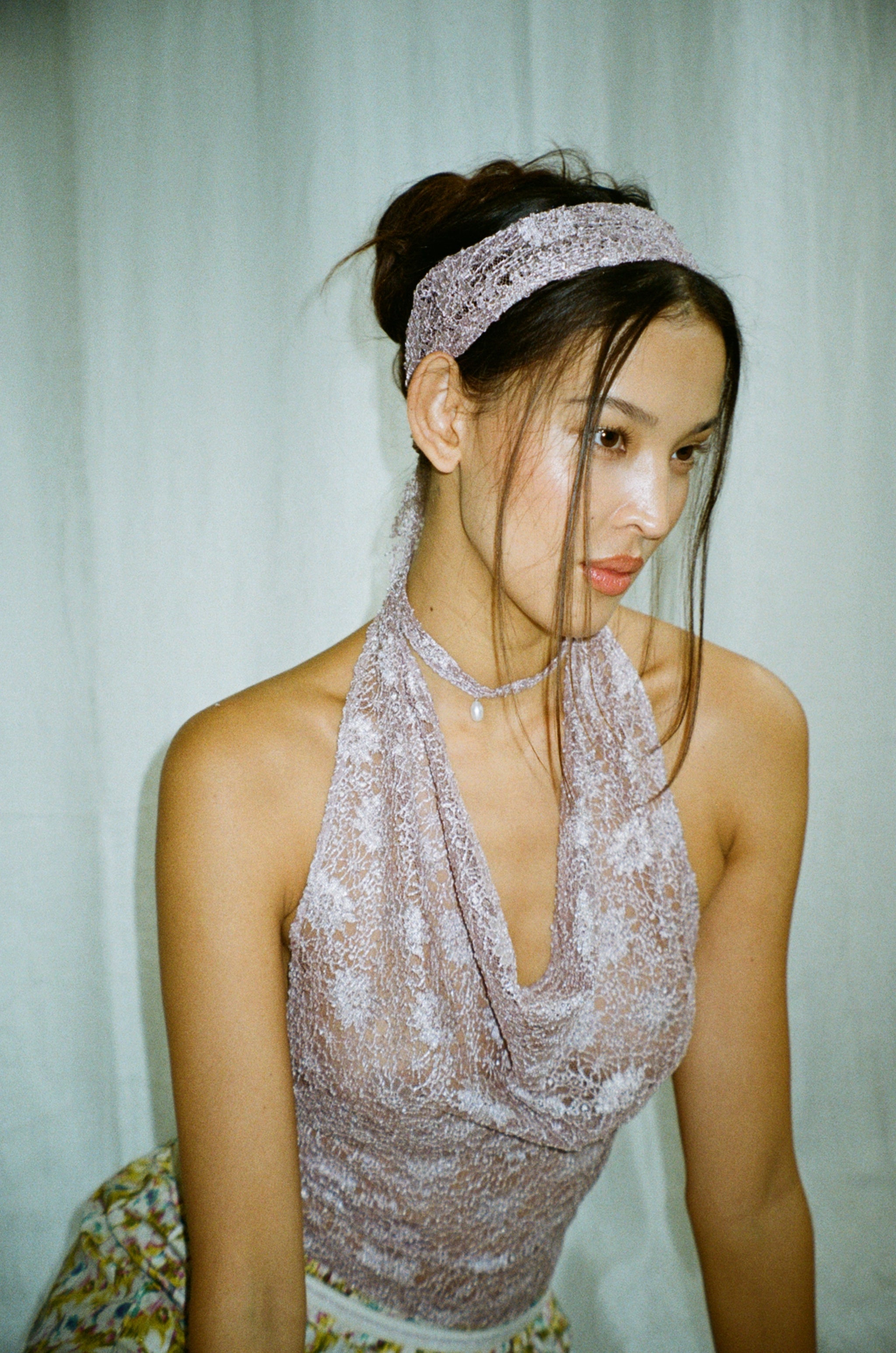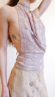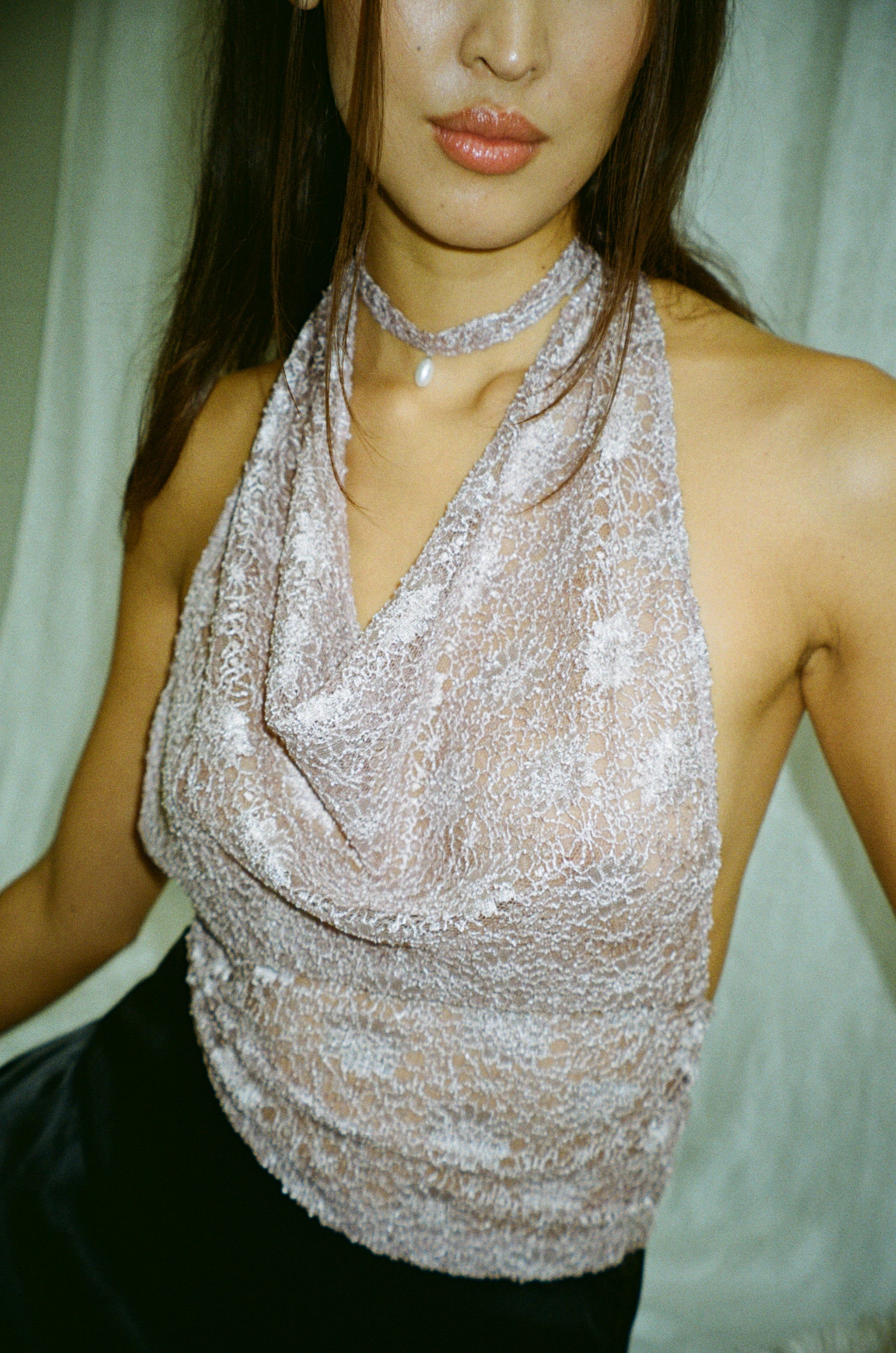 Lace halterneck top with open back and a fresh water pearl sewn into the collar. Caters to a range of cup sizes. Has stretch to easily through over the head, no buttons needed.
