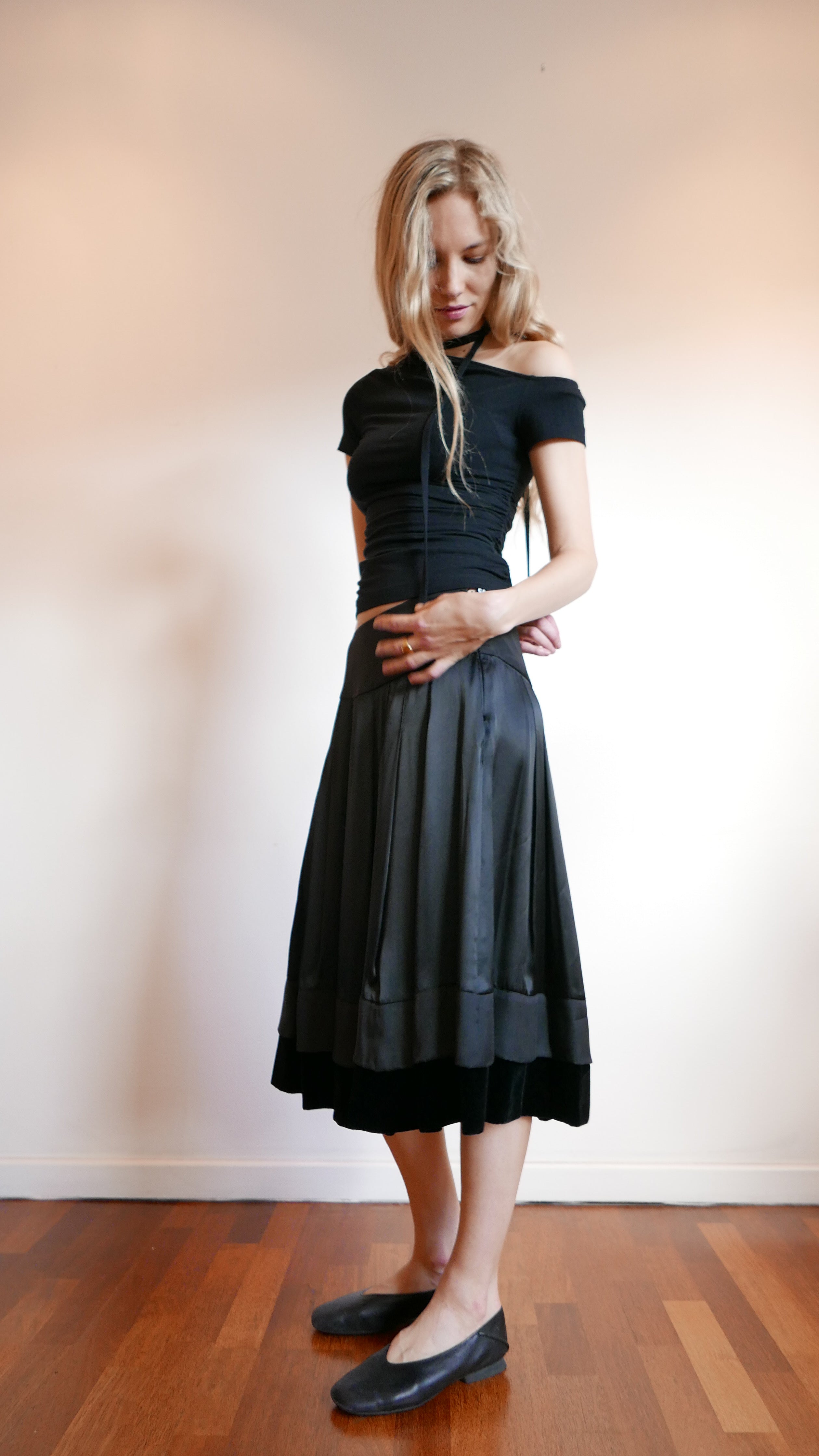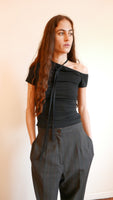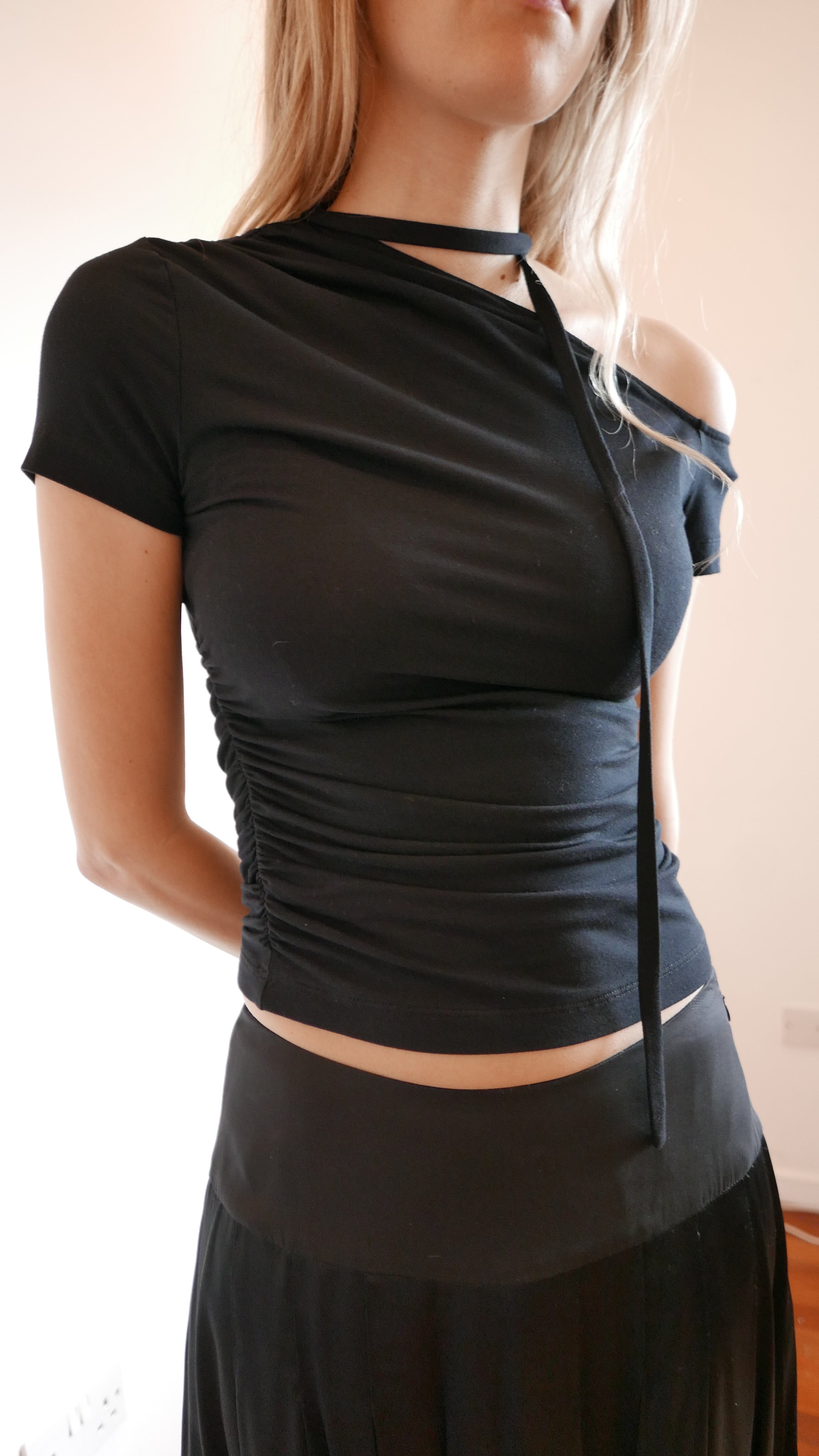 Asymmetrical short sleeve fitted top with neck tie made to style as you please.