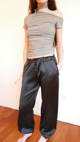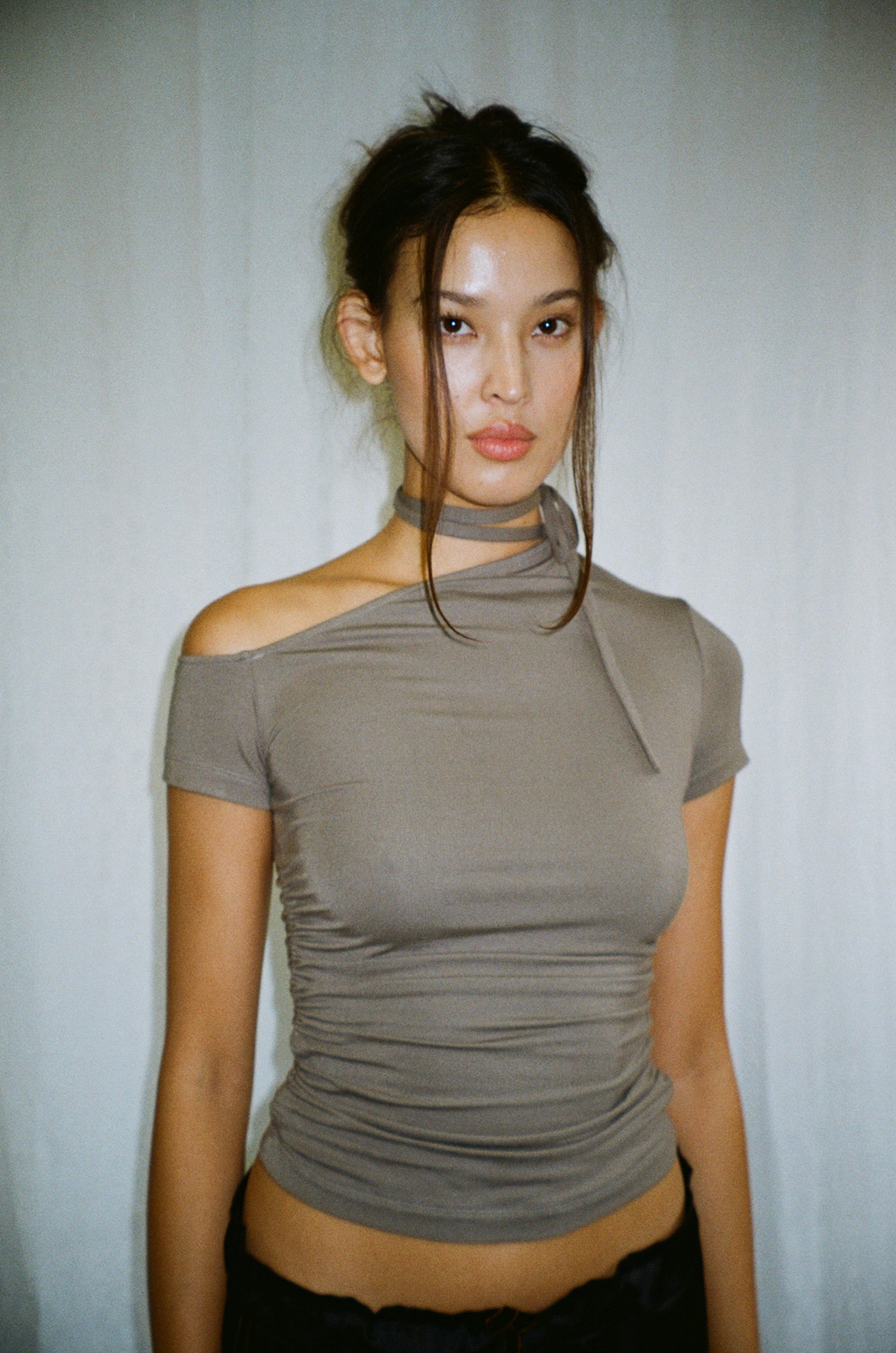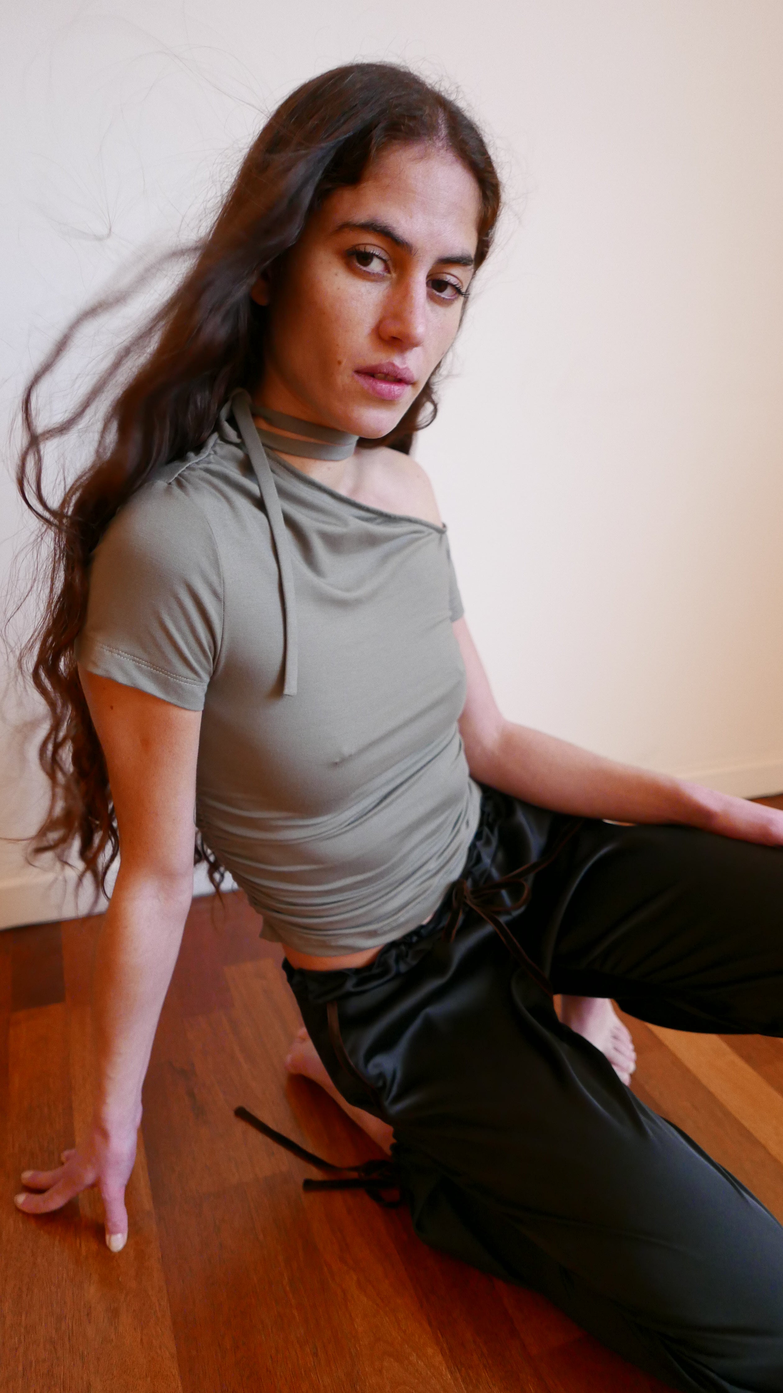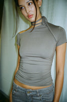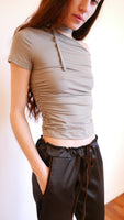 Asymmetrical short sleeve fitted top with neck tie made to style as you please.