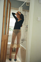 3/4 length lace bodysuit with baby blue silk ribbon on the neck lining. Stretch lace fabric allows for movement and a variety of different cup sizes. Snap buttons included.