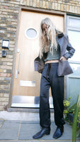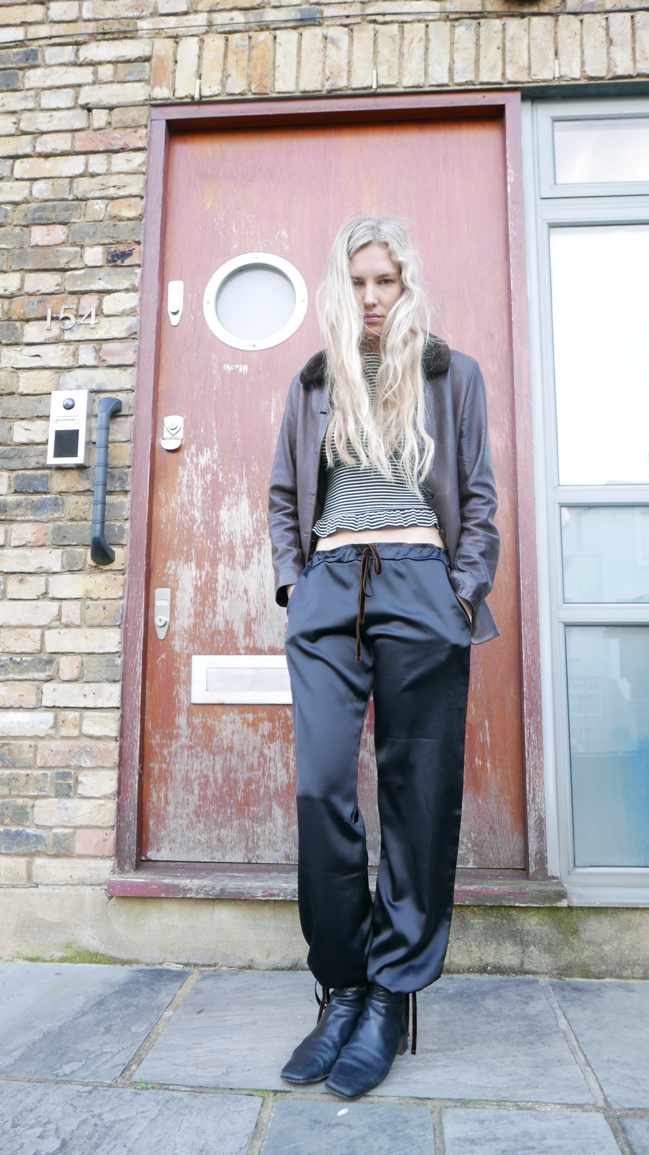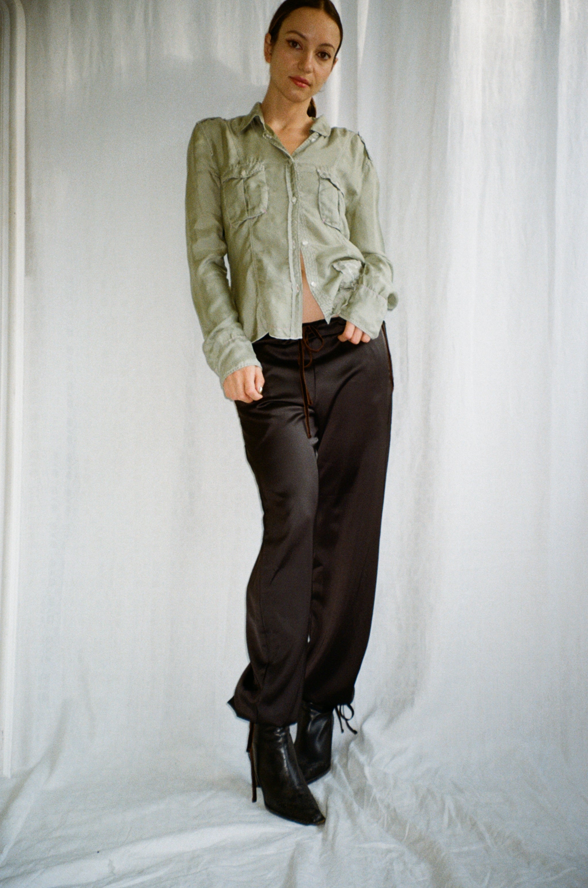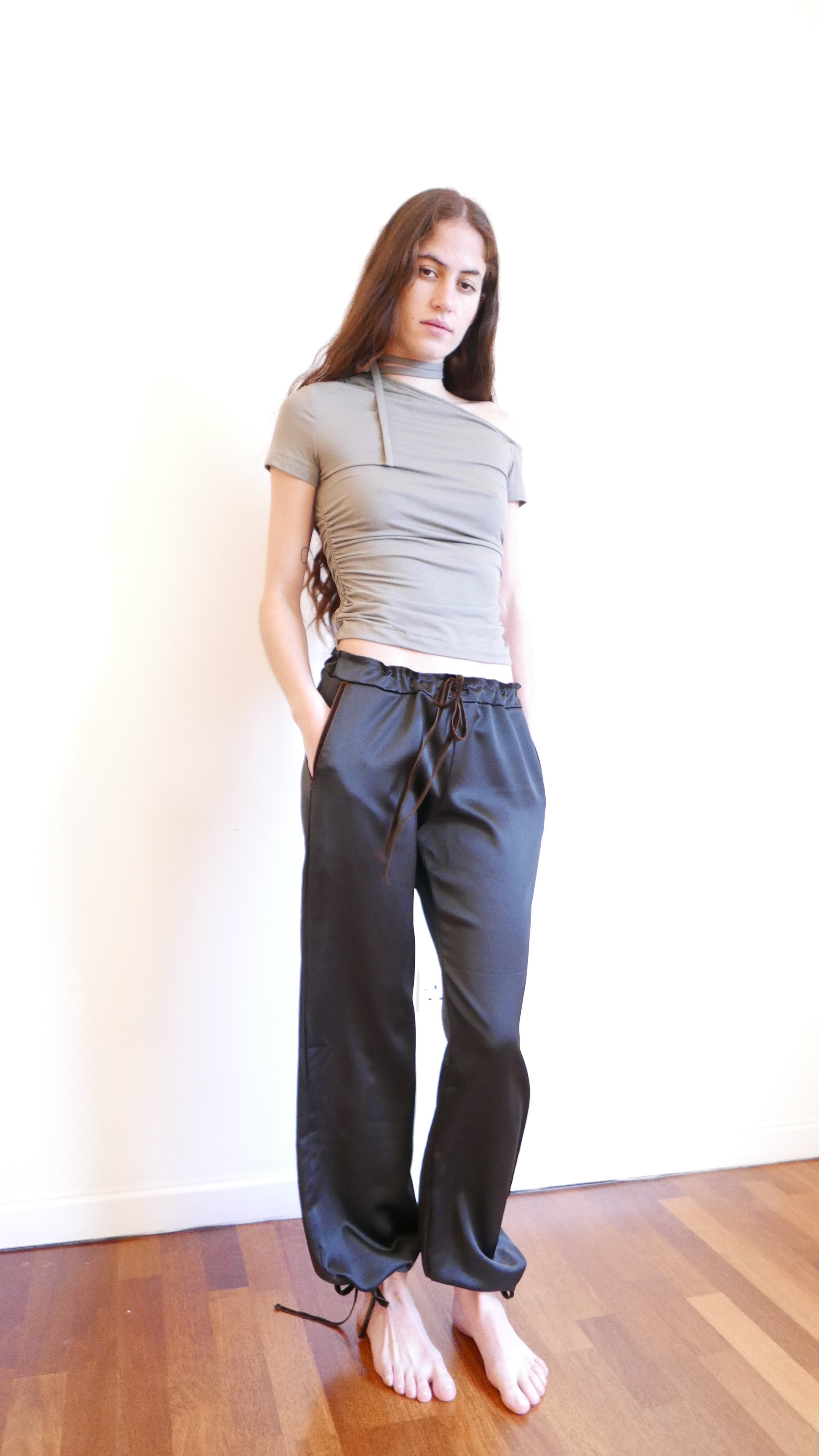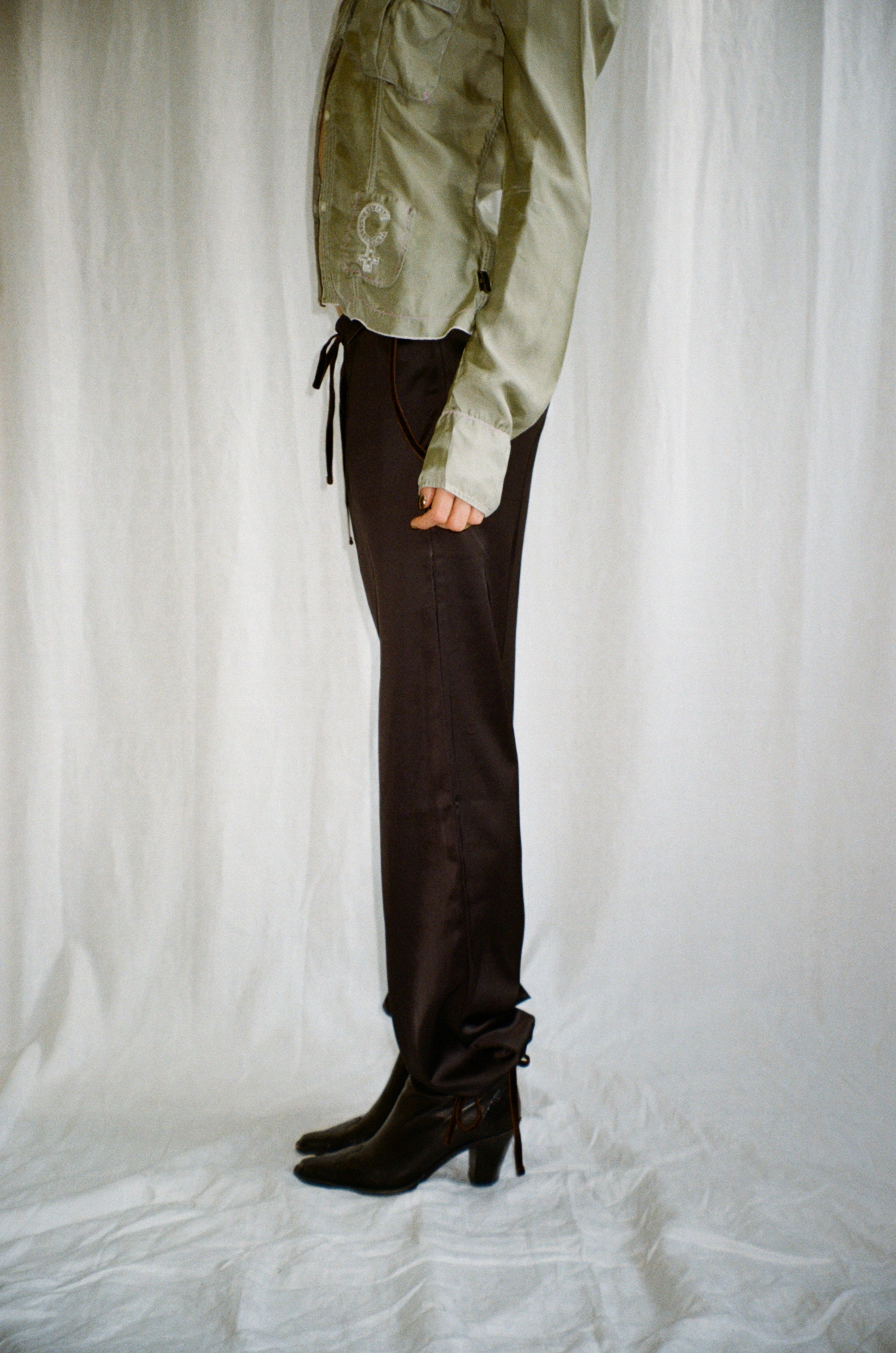 Silky, straight-fit, low rise trousers. With brown velvet detailing around the waist, on the pockets and to tie the trousers how you'd like them at the bottom. Versatile, comfortable, adjustable.
